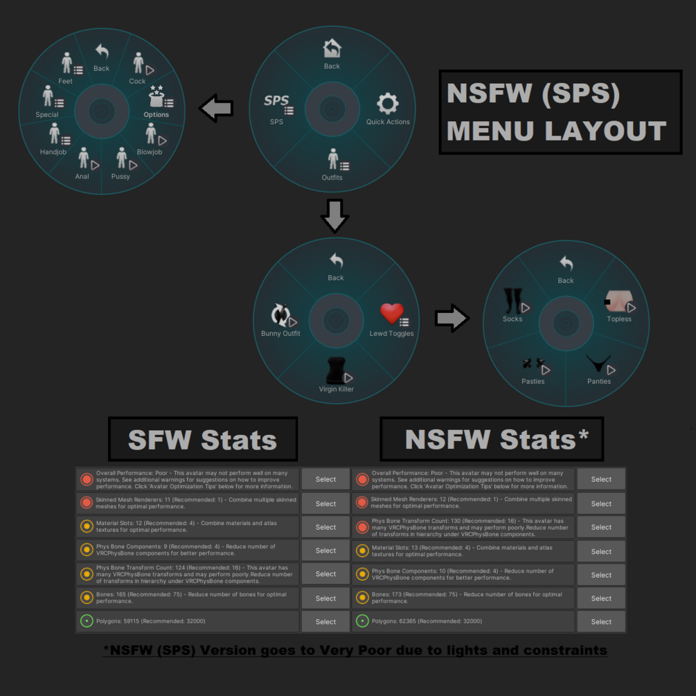 Outfit Swap between Bunny Outfit, Virgin Killer Sweater, and Panties + Pasties. Also has toggles to remove individual pieces of clothing.